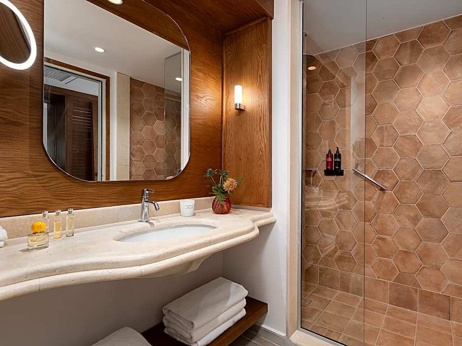 These rooms have king-sized beds. One has a side sea view and high street view and is a larger room. The other has a beach and sea view. Both have private bathrooms with a shower and toilet, kettle and coffee pod machine, flat-screen TV and Egyptian cotton bed linen.
